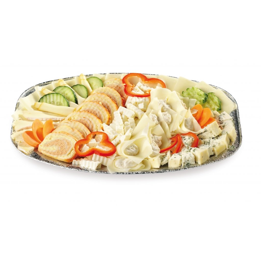 Složení: Sýr Eidam, sýr niva, uzený sýr, sýr Balkán, hermelín, sýrová roláda, česneková pomazánka, paprika, salátová okurka.